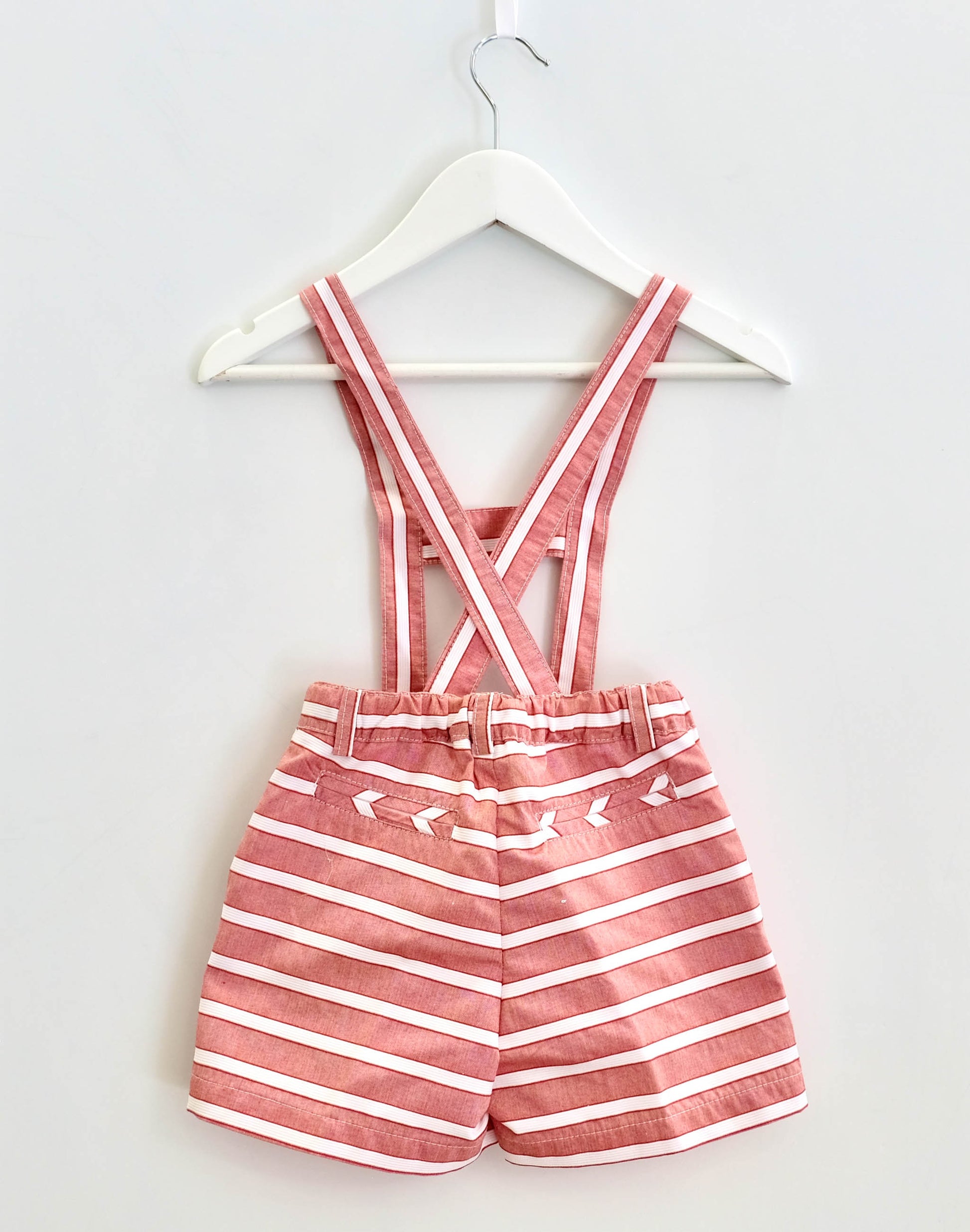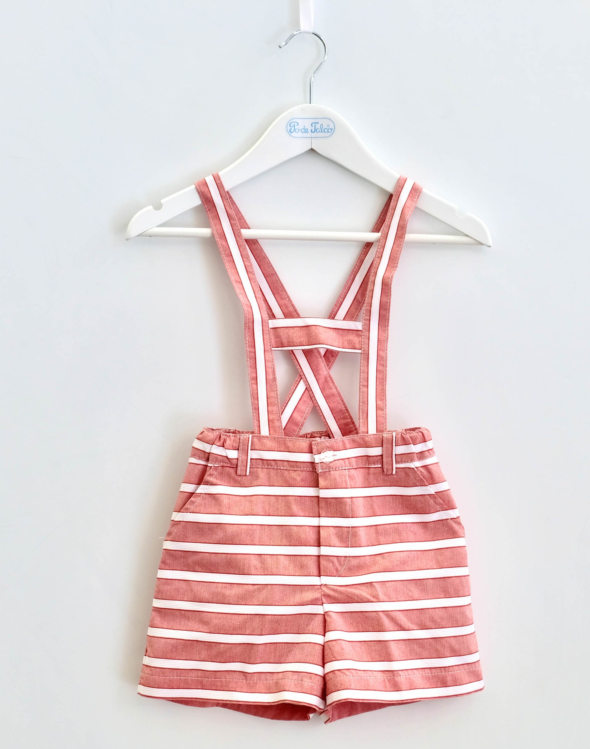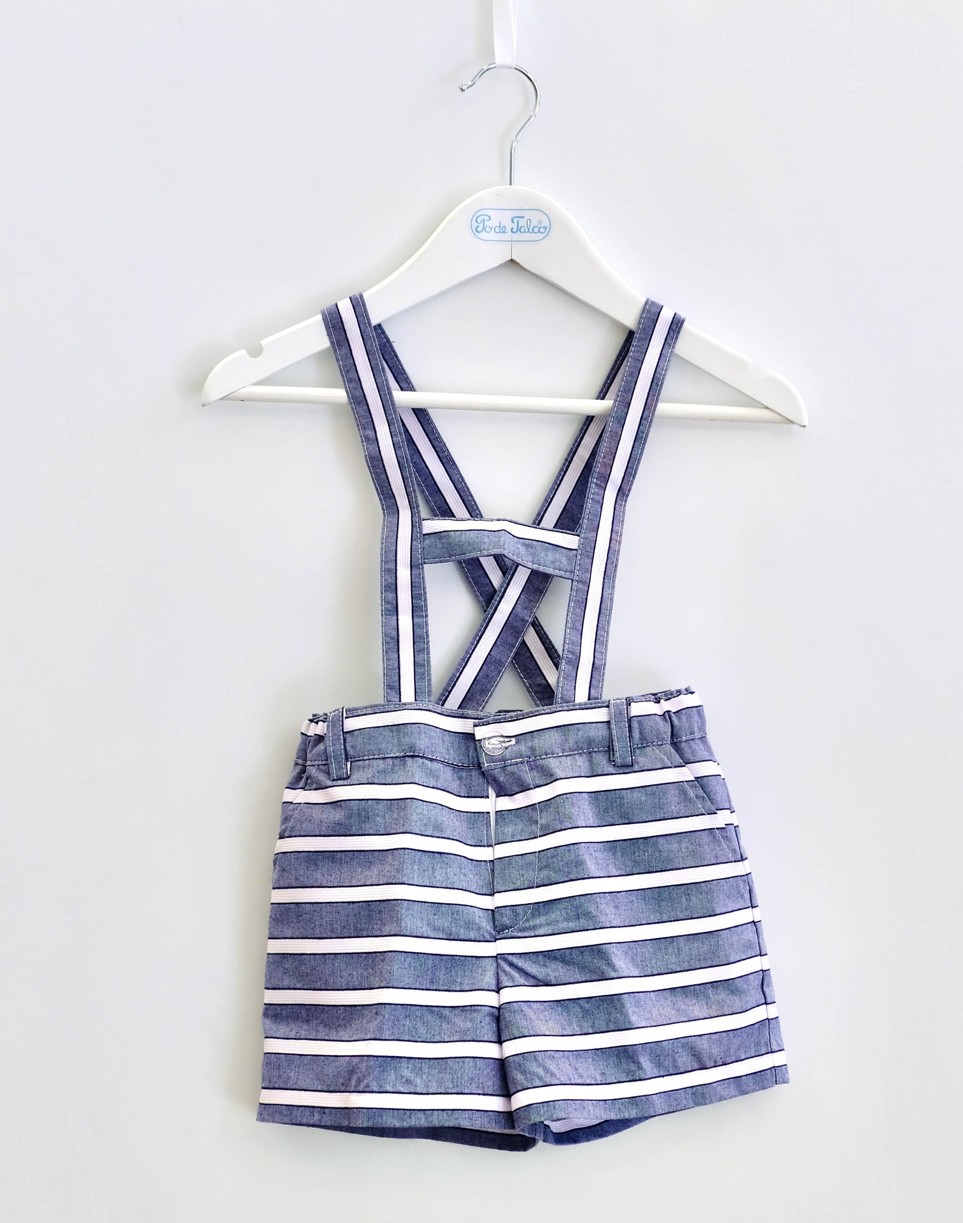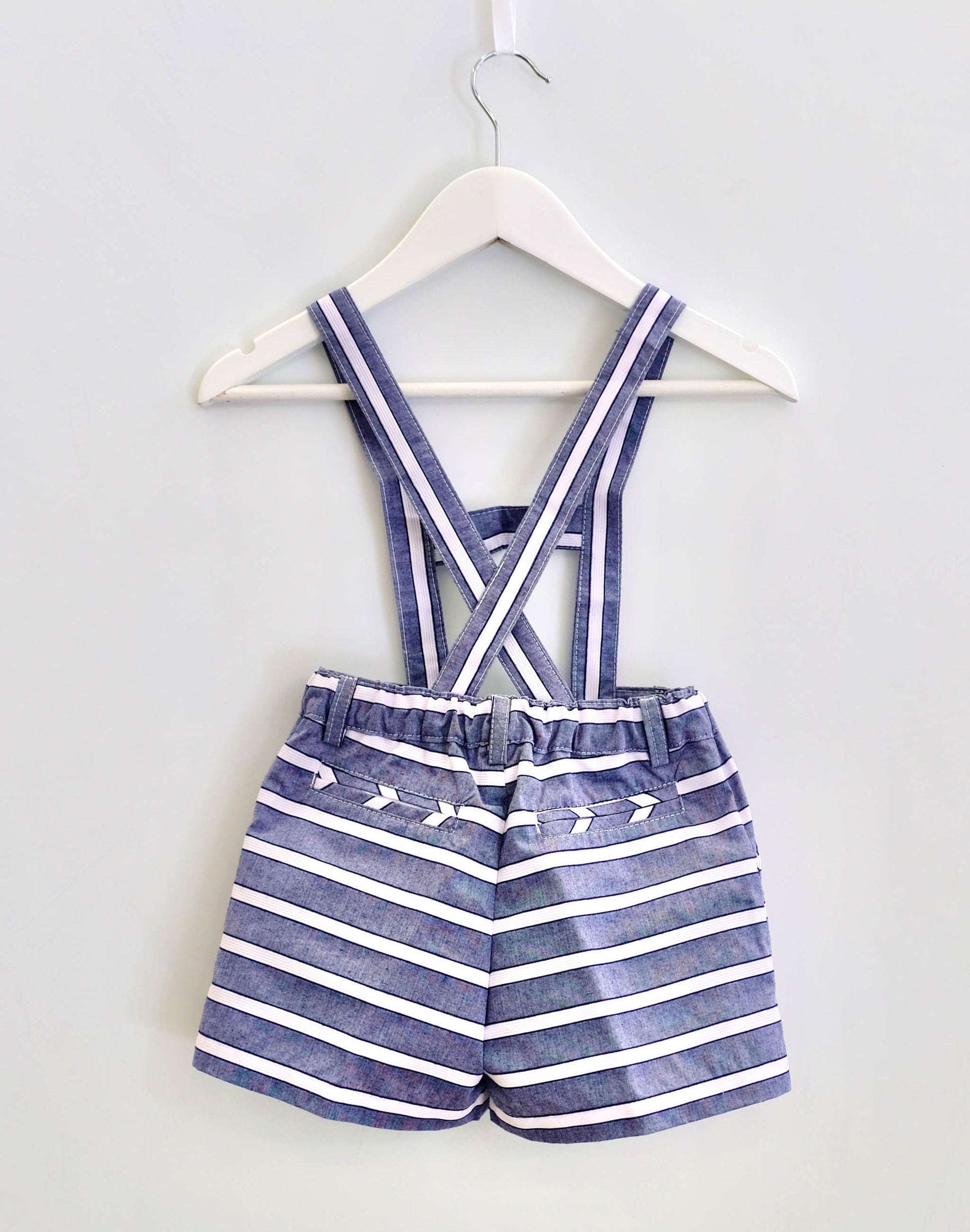 Calção rapaz em risca larga com dois bolsos laterais. É ajustável na cintura com elástico e forrado. Tem alças até aos 3 anos que pode retirar.
